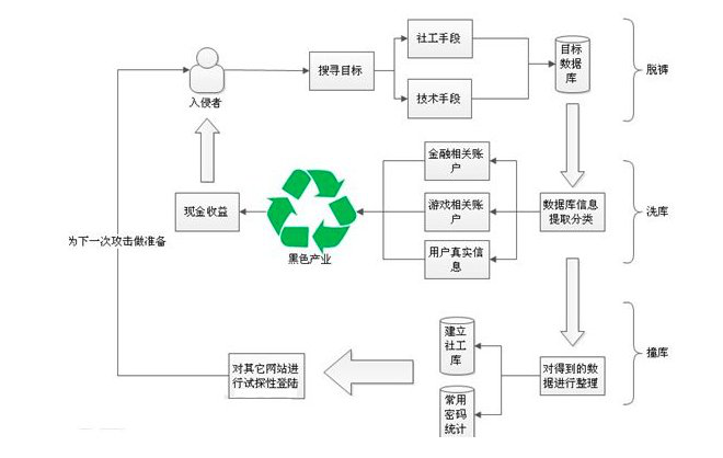 在拖库后,取得大量的用户数据之后,黑客会通过一系列的技术手段和黑色产业链将有价值的用户数据变现,这通常也被称作“洗库”。最后黑客将得到的数据在其它网站上进行尝试登陆,叫做”撞库“,因为很多用户喜欢使用统一的用户名密码,”撞库“也可以是黑客收获颇丰。 说白了,洗库就是数据变现! 下面通过一张图(来源于网络)看描述“脱库”、“洗库”、“撞库”三者之间的关联。