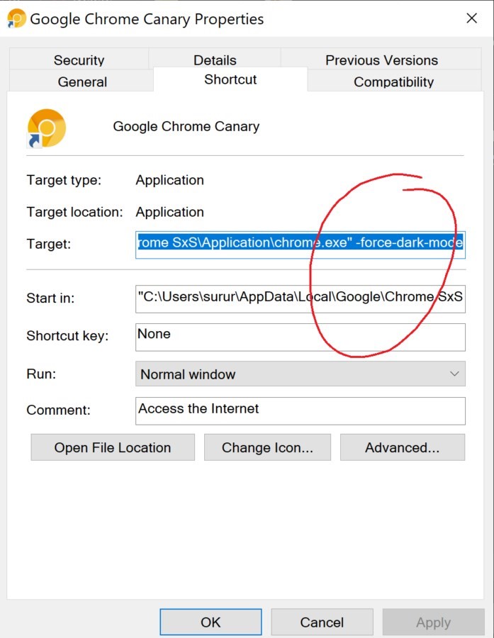 在目标字段中,在空格后的chrome.exe之后,添加-force-dark-mode,单击“应用”以保存更改。