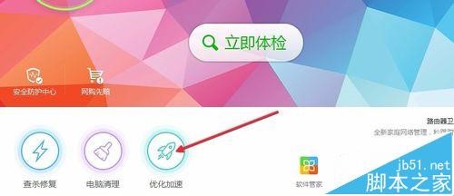 2、如果电脑安装有360安全卫士的话,我们可以打开360安全卫士。打开360安全卫士以后,我们点击界面这里的优化加速选项。