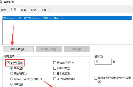 2.待系统配置界面弹出后,依次选取“引导”、“安全引导”,再按下“确定”按钮;(艾锑无限)
