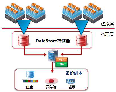 虚拟化部署、MA物理部署。备份代理VSA直接以Hot-add方式获取快照列表,并通过MA以LAN Base的方式备份到备份介质。