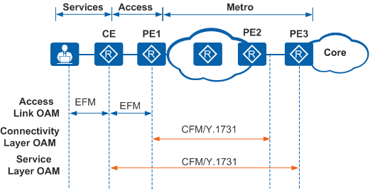 · 802.1ag(Connectivity Fault Management,简称CFM)定义了基于以太网承载网络的连接检测的OAM功能,包括CC/LB/LT,适用于大规模组网的端到端场景,是网络级的OAM。