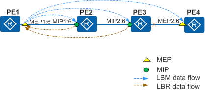 如果MEP1到MEP2之间的路径有故障,则故障点下游的MEP或MIP将无法收到LTM,也不会回复LTR,可据此判定故障点的位置。例如当MEP1到MIP2之间的路径正常,而MIP2和MEP2之间的路径有故障时,MEP1可以收到MIP1、MIP2回复的