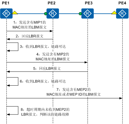 LTR,但收不到MEP2回复的LTR,于是可判定MIP2和MEP2之间的链路或设备有故障。