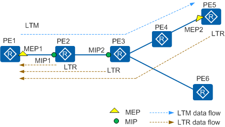 由MEP发起,目的节点可以是同一MA内的或不同MA内的,与发起节点级别相同的MEP或MIP。源端MEP构造LTM消息帧,发送到目的MP。在转发到目的MEP或者MIP的过程中,MIP会回复LTR,同时转发LTM,到达目的MEP则终止LTM的转发同时回复LTR。这样,远端MEP就会得到整个路径的信息。LTM是组播报文,LTR是单播报文。