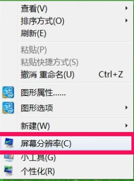 鼠标右键点击桌面的空白处,弹出菜单之后选择“屏幕分辨率”,如下图所示: