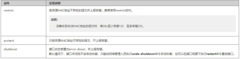 接口上安全MAC地址数达到限制后,如果收到源MAC地址不存在的报文,端口安全则认为有非法用户攻击,就会根据配置的动作对接口做保护处理。缺省情况下,保护动作是丢弃该报文并上报告警。