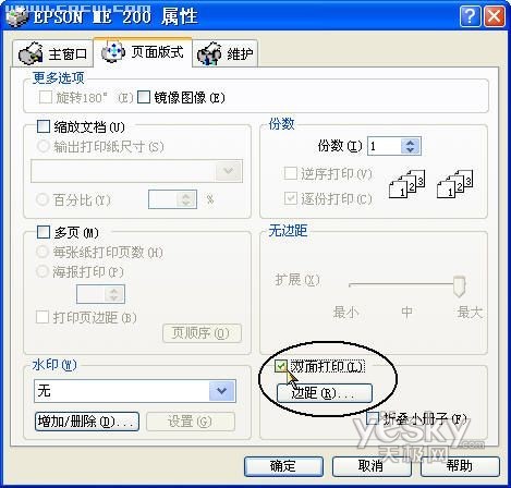 目前有不少打印机的驱动程序中就提供了双面打印设置。我们可在控制面板的“打印机和传真”里调出安装的默认打印机,右键单击默认的打印机图标,选择“属性”,打开该打印机的属性窗口,在这个窗口中一般就可以找到设置双面打印的项目了。以爱普生ME200来说,在打印机属性窗口的“页面版式”选项下就有一个“双面打印”复选项(图3),选中此项即可进行双面打印。而佳能IP1600的双面打印选项则是在“页设置”选项下。