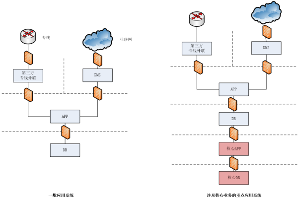 弱物理隔离。绝大部分传统金融企业应该都是属于这种模式。网络设备、主机系统根据需要一般是每个网络安全域一套,但是,安全域之间一般可以通过网闸、单向数据传输设备建立了特定的安全传输通道。