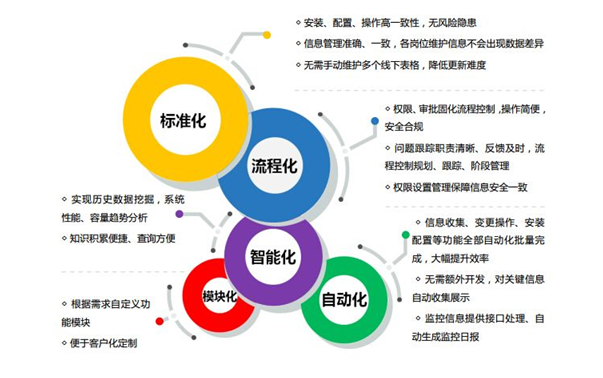 第一是循序渐进的原则,特别是中小公司或者初创公司,很多时候并不需要一个“高大上”的系统。聚焦当前的问题,把当前的问题处理好,后面的问题也就迎刃而解。如果一开始设计的系统很庞大、功能特别丰富,会导致一些无法控制的局面。比如这个系统可能最后做不下去了,或者因为耦合性太强,开发控制不了了,或者项目因为经费问题搁浅了。但是如果一开始的目标是解决一些特定的问题,有针对性,那么推进起来也会比较简单。在我司的自动化运维体系建设过程中,我们首先构建的是一个基础的服务器批量操作平台,先把一部分需要重复执行的工作搬到平台上来,再依据运维的需求丰富这个操作平台的功能和提升效率,最后把周边的系统打通,相互对接,形成完整的自动化