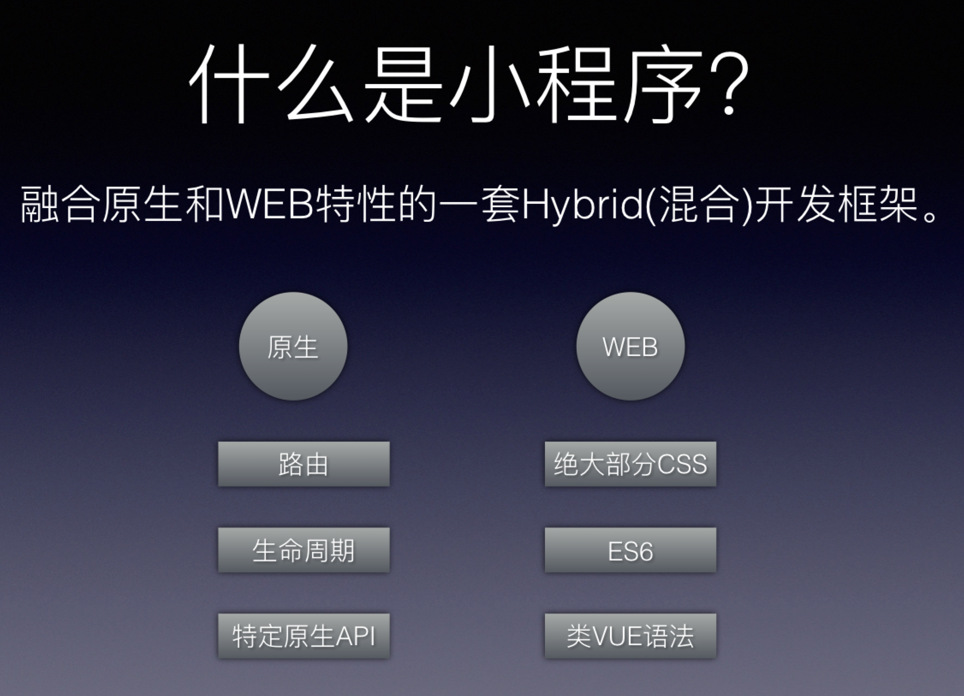 小程序开发如火如荼,今天跟大家剖析下小程序的原理。小程序本质上是一套Hybrid开发框架,因此从技术上看,小程序属于旧瓶装新酒。但是依托于微信这个超级平台,在配合线下无数的轻量使用场景,小程序推出的时机恰到好处。从技术实现的角度看,小程序是融合原生和WEB特性的一套Hybrid混合开发框架。从原生能力上看,每个小程序都有原生的路由管理,每个页面都能监听部分原生App的生命周期,同时暴露了特定的原生API。从WEB能力上看,小程序支持绝大部分CSS,支持Javascript的ES6语法,同时借鉴了现代WEB框架的响应式开发理念,提供了类VUE的model和view绑定机制。