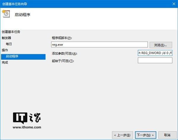 新建一个任务计划,运行“创建基本任务向导”,填写任务计划的名称,例如“自动切换到浅色模式”,设置任务触发器,在“希望该任务何时开始”下选择“每天”,设置每日自动开启浅色模式的具体时间,例如早上7:00(和自动关闭夜间模式的时间同步),将该任务执行的操作选择为“启动程序”,将要启动的程序选择为“reg.exe”,将参数设置为: