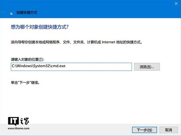 第一步:桌面点击右键,选择“新建>快捷方式”,在弹出的对话框中,找到”请键入对象的位置“一栏,填入X:\Windows\System32\cmd.exe(X是你的系统盘盘符),然后点击”下一步“。