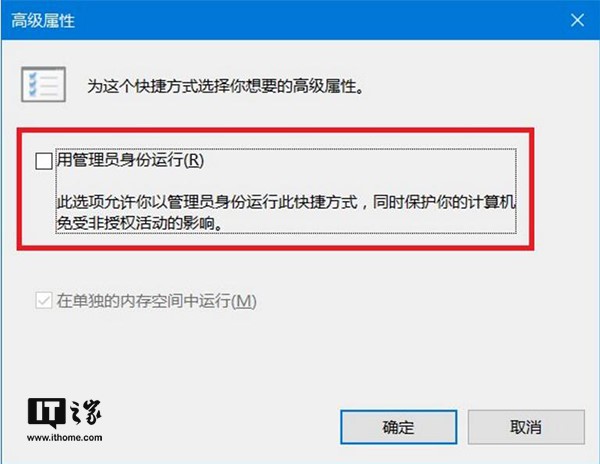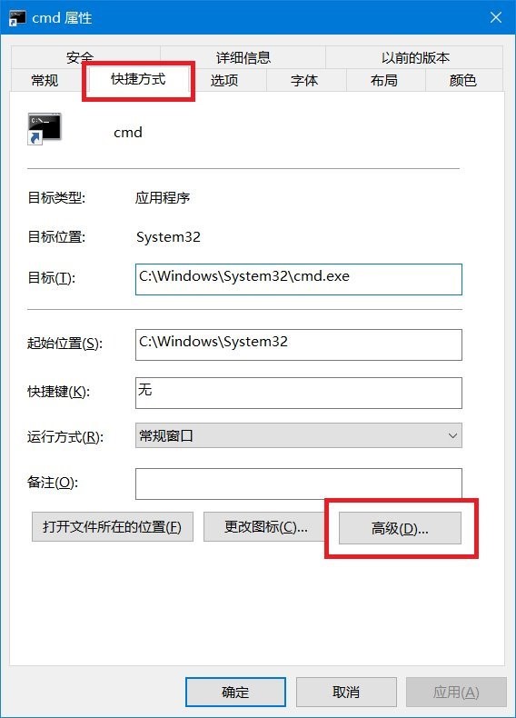 第三步:确认无误后,请右键打开该快捷方式的”属性“,找到”高级(D)…”按钮并点击,在弹出的窗口中勾选“用管理员身份运行(R)”。