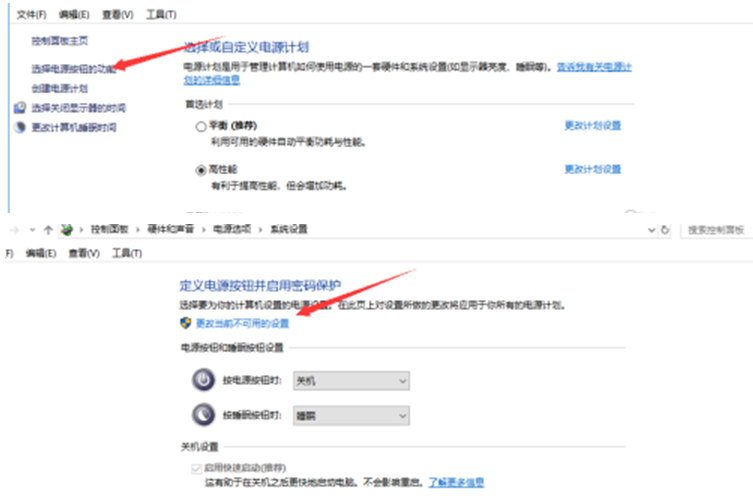 然后点击"选择电源按钮的功能",在当前页面点击“更改当前不可用的设置”