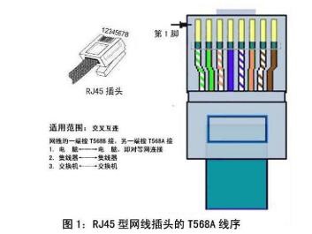 如图1 所示,RJ45 型网线插头各脚与网线颜色标志的对应关系是: