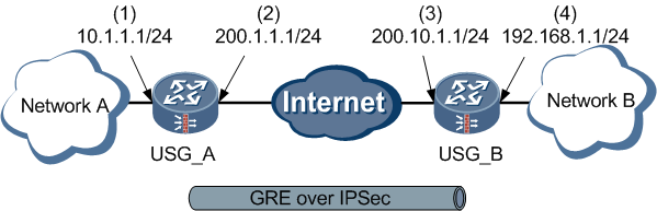 如图10-29所示,网络A和网络B通过USG_A和USG_B连接到Internet。USG_A和USG_B之间建立GRE over IPSec隧道。