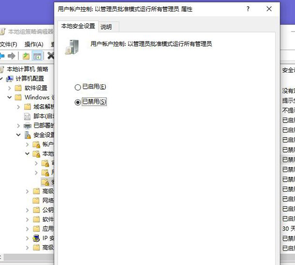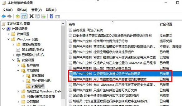 5、在右侧窗口中找到“用户账户控制:以管理员批准模式运行所有管理员”设置为“已禁用”。
