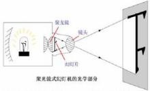 聚光反光混合式幻灯机的光学部分主要由光源(溴钨灯)、深椭球冷光反光镜、平面反光镜、聚光镜、放映镜头(投影物镜)等组成。
